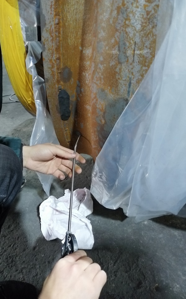 客户现场的大腔体容器容积为2 m3,漏率要求为6.9*10-10Pa.m3/s。因为工件漏率要求很高,所以要求工件内部要抽得足够干净,所以茄子视频成人在线观看建议客户配置分子泵组作为辅抽泵,同时配置真空计检测腔体真空度。茄子视频黄片下载连接在分子泵的排气口和机械泵的进气口之间。泵组与容器上焊接的KF40法兰直接相连,先开机械泵对容器腔体抽真空,当真空度达到10Pa时开启分子泵。经过大约一个半小时的抽空,容器腔体内真空度达到了0.5Pa,此时打开检漏仪检漏口的真空挡板阀,测得系统本底值为5.0*10-10Pa.m3/s,即可以进行喷氦检漏。茄子视频成人在线观看由近及远,由上到下,在法兰连接及焊缝处等可疑漏点喷吹少量氦气,观察检漏仪的读数是否上升,来查找漏点并进行封堵。待查完漏点后,再用薄膜将容器整体包裹住,向薄膜内充一定浓度的氦气,可通过氦气浓度仪来判断充入氦气的浓度。观察检漏仪稳定后的读数,即可判断工件整体漏率是否合格。